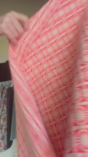 The Neon Lights is sooooo 70's poly leisure suit. It is thick and forgiving with the perfect stretch. The neon pinky orange base color is very fun and easy to mix and match with. You can wear this year around and in any style skirt.